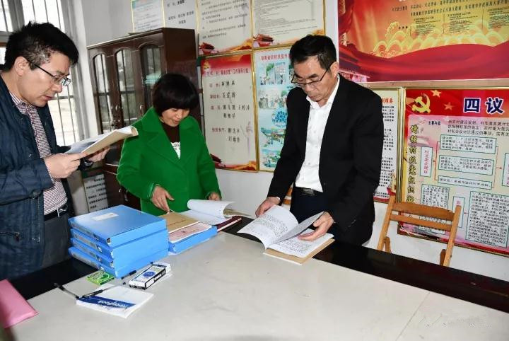 图为县委书记阳晓华检查坪上镇合心村党建资料