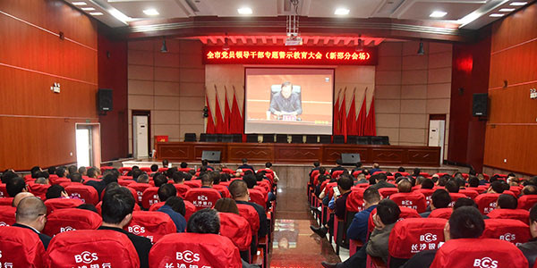 11月12日,新邵县委书记阳晓华,县委副书记、县长陈历贤等全体在家县领导及各乡镇、各单位部门主要负责人,集中收听收看全市党员领导干部专题警示教育大会视频会。