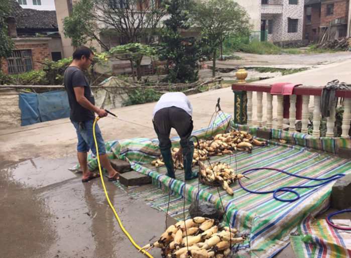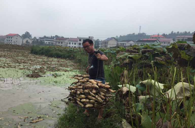 荷田最好看时候是夏天,那个时候荷叶挨挨挤挤,荷花点缀其间,甚是好看。”张强平说,虽然莲藕一年四季都可挖,不过八月开始才是挖藕最忙碌的季节,一直要挖到年末。他是该镇莲藕种植面积最大的业主,他从四年前发展到现在100余亩,积累了丰富的种植经验,更打开了莲藕的销路。“我在我们村流转了80余亩水田,销售收入近50余万元,除去人工和种植成本,还是比在外面打工强。”记者看到,张强平还从湖北用高薪请了一位师傅过来传授挖藕技术。莲藕种植人工成本比较高,挖藕环节已经使用机械辅助。不然成本更高。据了解现在张强平的莲藕优质无任何一点污染,绿色生态,脆、白、甜,品质好,营养又健康。藕田除草都是用人工,没打过一丝农药。基地莲藕产量每亩约3000斤,目前批发价在每斤4元左右,每斤莲藕的人工成本近2元。每年付给当地村民的工资就达20余万元。
