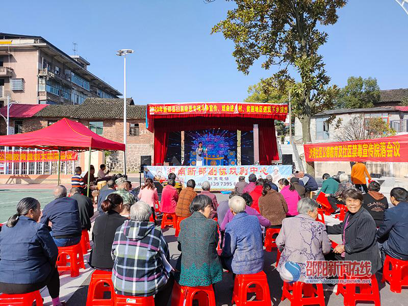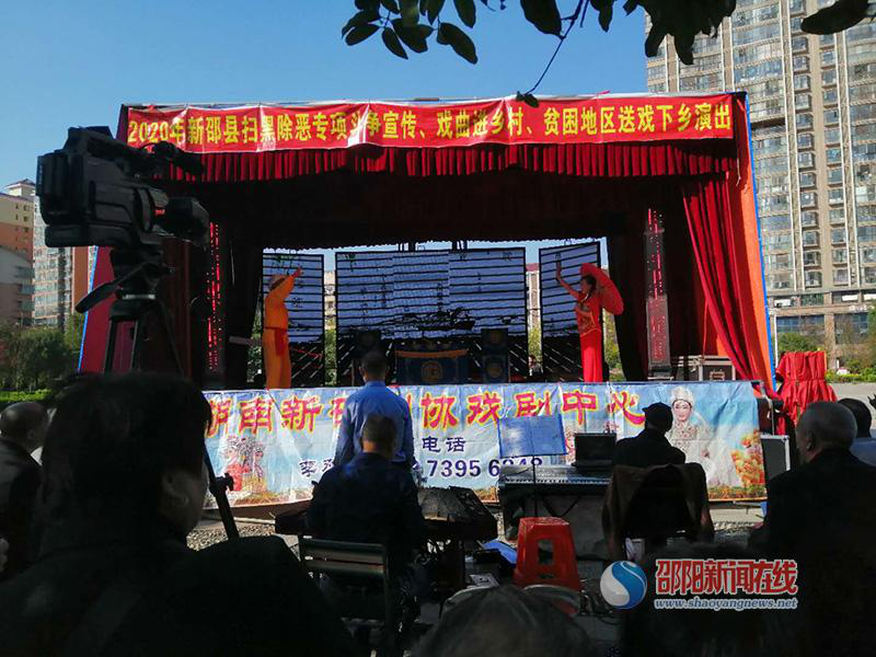 11月11日上午,新邵县酿溪镇沙湾社区文化活动广场人头攒动,热闹非凡,2020年新邵县扫黑除恶专项斗争宣传、戏曲进乡村、贫困地区“送戏下乡”演出正在这里上演。