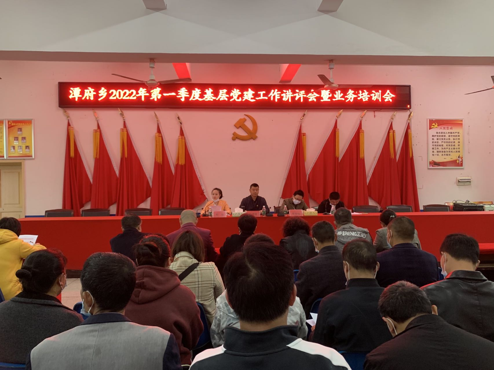 4月15日,潭府乡召开第一季度基层党建工作讲评暨业务培训会,乡党委书记黄建桂、县委组织部组织指导组组长李海铭、乡组织委员刘玲、乡基层党建办全体成员、全体驻村干部、党(总)支部书记及有关村干部参加会议。