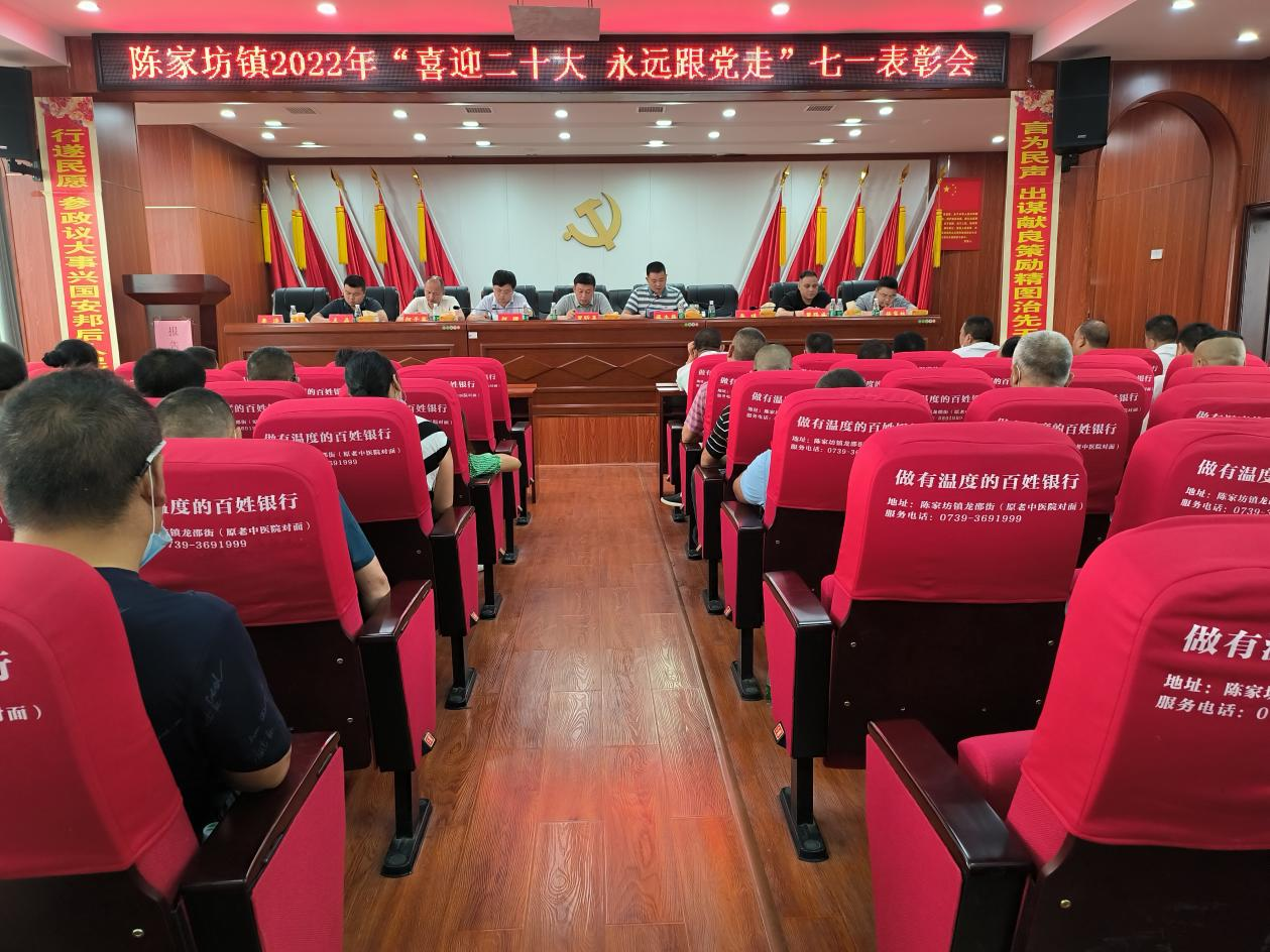 在中国共产党成立101周年来临之际,6月29日上午,陈家坊镇召开“喜迎二十大,永远跟党走”七一表彰大会,表彰2022年政治过硬、业绩突出、作风优良、群众公认的先进基层党组织、优秀党务工作者和优秀共产党员,激励全体党员干部持续弘扬伟大建党精神、赓续红色血脉,牢记初心使命、勇于开拓进取,以实际行动忠诚拥护“两个确立”、做到“两个维护”,凝心聚力推动新时代陈家坊镇工作高质量发展。