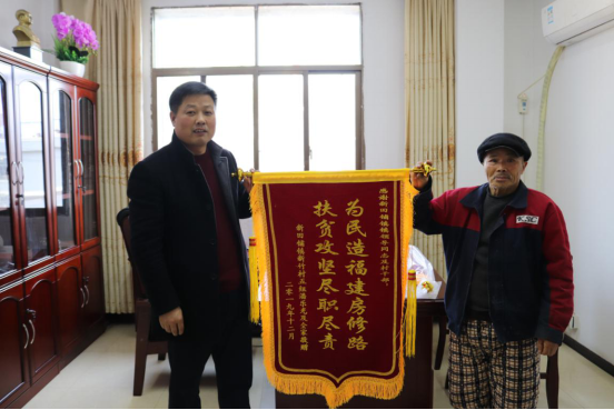 12月2日,新田铺镇新竹村村民潘乐光将一面“为民造福建房修路,扶贫攻坚尽职尽责”的锦旗,送到了镇党委书记邓亦锋手中,由衷感谢镇党委政府为他家修建房屋和修通入户道路。