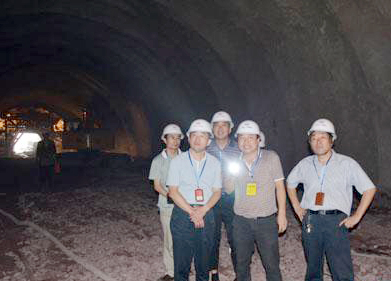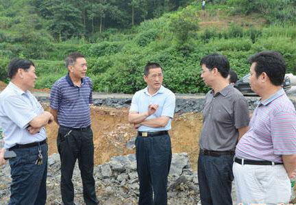 图为县委书记伍备战(左二)在察看邵坪高速寸石隧道建设