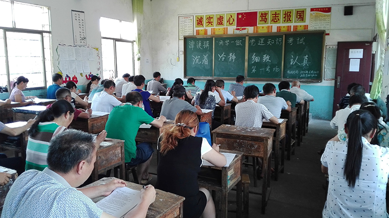 潭溪镇党政领导班子以及全体在职党员干部,与所属50个支部共178名党员同志在3个不同的考场一同默写入党誓词,一同作答“两学一做”学习教育相关基础内容。据了解,这是新邵县“两学一做”学习教育举行的第一场大规模的考试,考试以《党章》《准则》《条例》和习近平总书记系列重要讲话为主要内容,考试时长60分钟,满分为100分。考试结束后,还将安排统一阅卷,成绩优异的党支部和党员在镇“七一”大会上进行表彰,考试不合格者须及时补考。本次考试以支部为单位,分别派出3名党员同志参考,支部书记必须参加,潭溪镇党委初定每两个月安排一次考试,争取今年底对全镇所有的党员进行一次轮考。