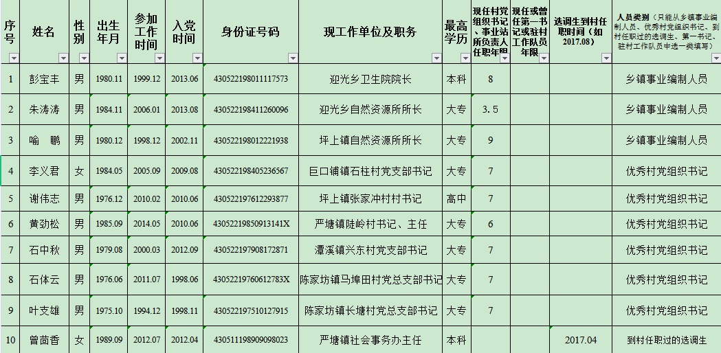 根据省委组织部和市委组织部有关文件精神,我县拟从从乡镇事业编制人员、优秀村党组织书记、到村任职过的选调生、第一书记、驻村工作队员(简称“五方面人员”)中择优选拔一批乡镇班子成员。经组织推荐和资格初审,彭宝丰等23名同志初步符合参加比选条件,现对名单予以公布,具体信息如下: