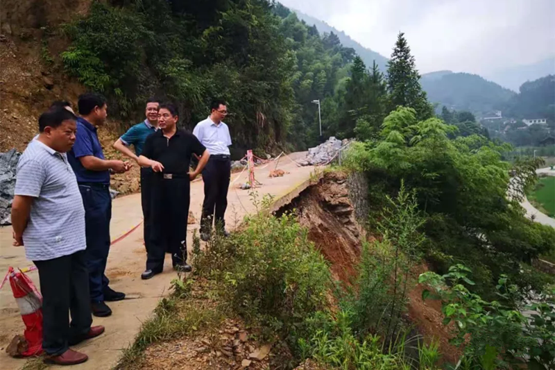 曹普华(前右二)一行察看龙溪铺镇梅岭村因灾受损道路