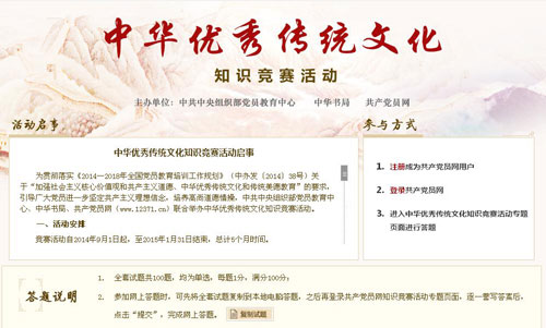 9月1日起,由中央组织部党员教育中心、中华书局、共产党员网联合举办的中华优秀传统文化知识竞赛活动正式启动。