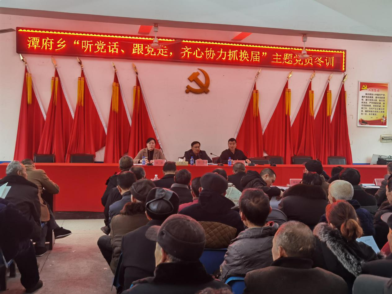 12月4日,潭府乡召开以“听党话、跟党走,齐心协力抓换届”为主题的党员冬训会,传达上级关于村“两委”换届选举工作精神,部署辖区内20个村的换届工作,全乡300余名在家党员参加培训。