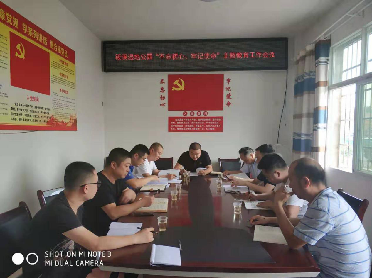 会议由新邵筱溪国家湿地公园管理处负责人傅翔同志主持并作动员讲话,县委主题教育指导第6组何定祥到会指导,管理处全体党员干部参加会议。