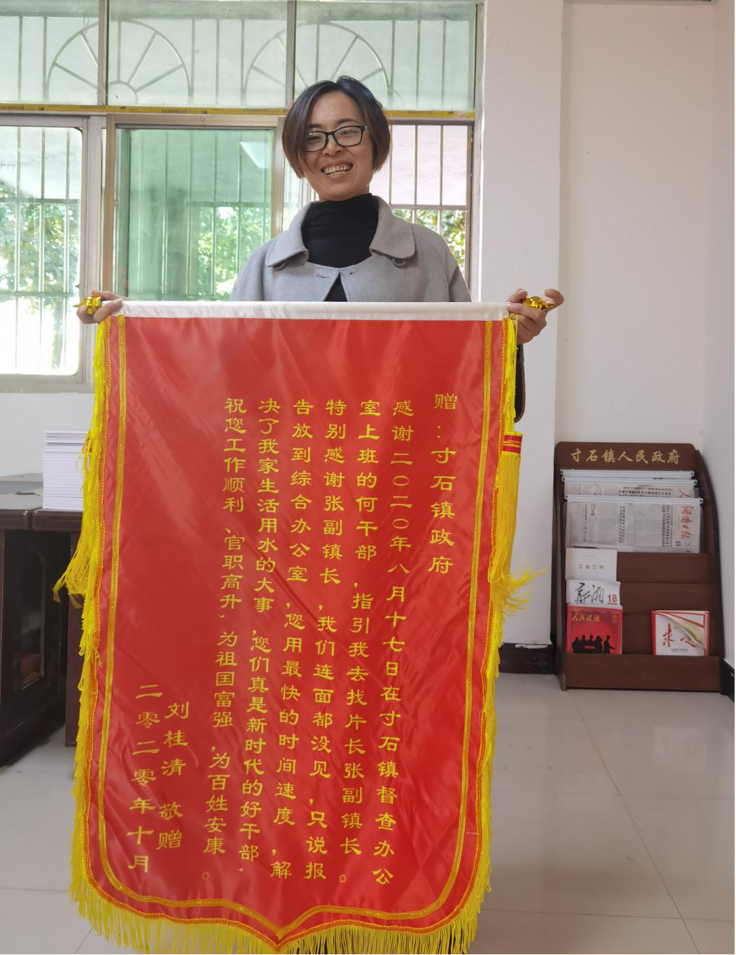 自政德教育“六个履职”实践活动开展以来,寸石镇全体干部担当展作为,为民解难题。11月16日,寸石镇党政综合办公室值班室收到一个来自贵州的包裹,里面是一面锦旗。原来是家住寸石镇梅市社区三组、目前远在贵州带孙子的村民刘桂清,为表达对镇领导干部及时解决他家饮水问题的谢意,特意通过快递寄来的。