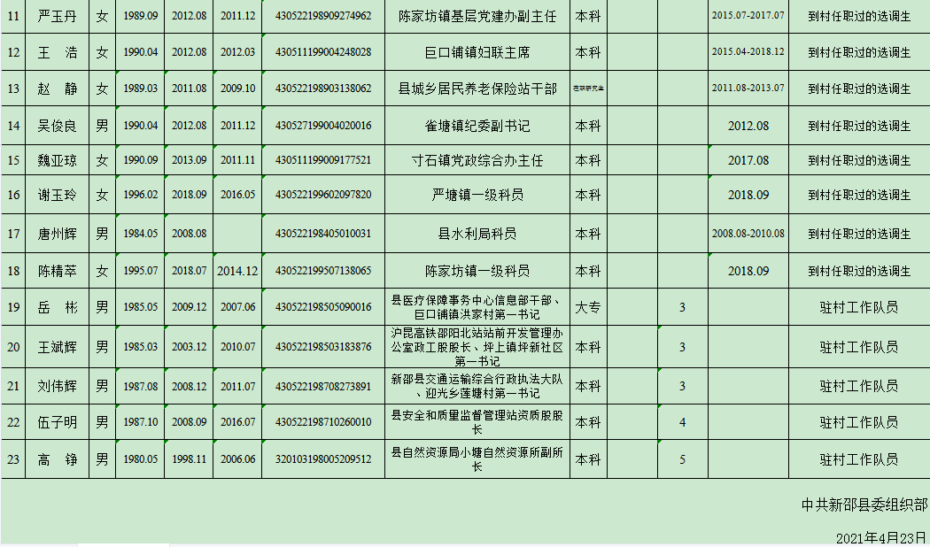 根据省委组织部和市委组织部有关文件精神,我县拟从从乡镇事业编制人员、优秀村党组织书记、到村任职过的选调生、第一书记、驻村工作队员(简称“五方面人员”)中择优选拔一批乡镇班子成员。经组织推荐和资格初审,彭宝丰等23名同志初步符合参加比选条件,现对名单予以公布,具体信息如下: